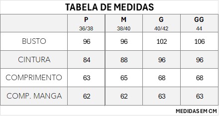 Atenção! Fazemos as métricas com a peça fora do corpo e sem esticá-la.