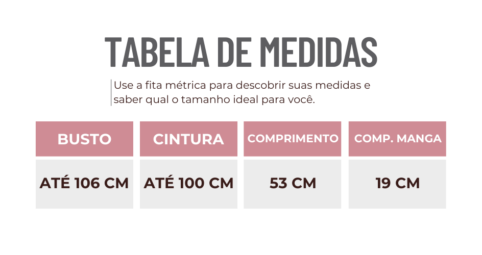 Medidas da modelo: Altura 156cm | Busto 86cm | Cintura 68cm | Quadril 102cm