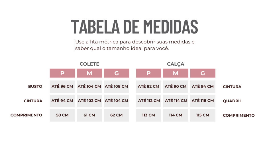 Atenção! Fazemos as métricas com a peça fora do corpo e sem esticá-la.