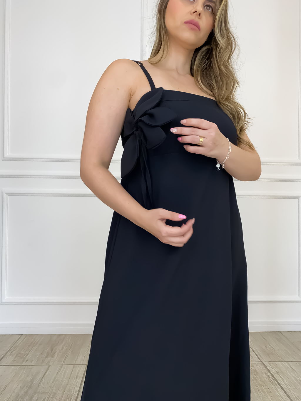 O detalhe em flor no busto adiciona um toque de charme, enquanto o elástico nas costas garante liberdade de movimentos. Com um caimento fluido, esse vestido é ideal para diversas ocasiões, desde jantares formais até passeios ao ar livre.